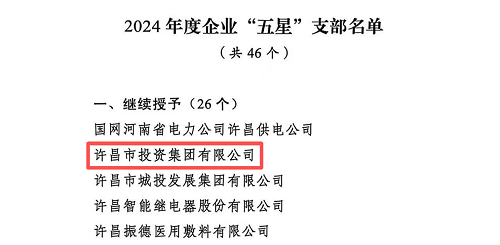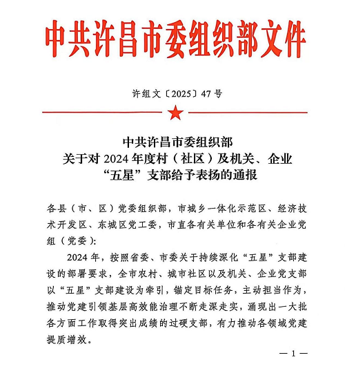 近日,中共許昌市委組織部印發(fā)了《關(guān)于對2024年度村(社區(qū))及機關(guān)、企業(yè)“五星”支部給予表揚的通報》,許昌市投資集團黨委被繼續(xù)授予“五星”支部榮譽稱號,這是集團黨委自2022年以來連續(xù)三年獲此殊榮。